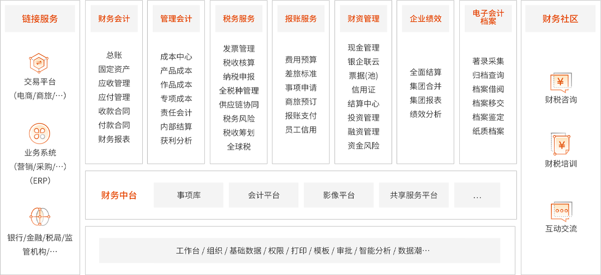 以实时会计、智能财务、精准税务、敏捷财资为核心理念,构建财务会计、管理会计、税务服务、报账服务、财资管理、企业绩效、电子会计档案、共享服务的全新一代财务体系